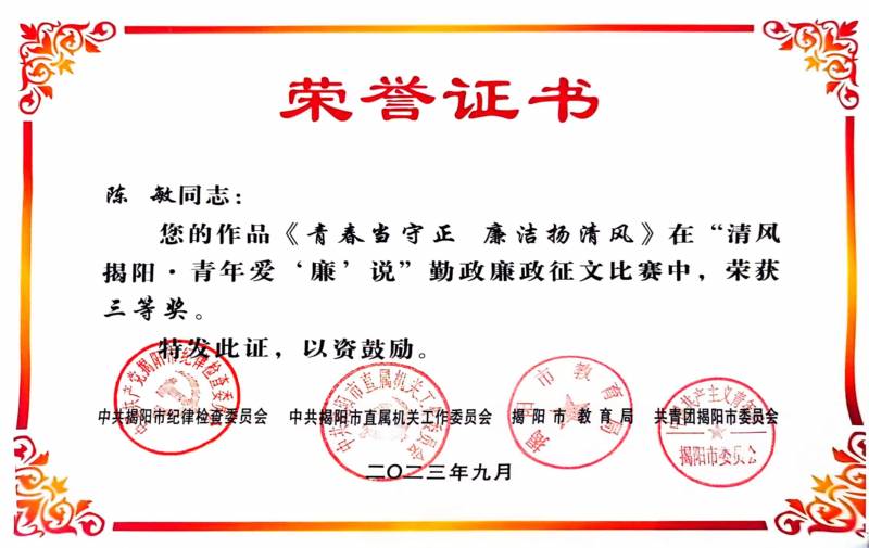 陳敏同志榮獲“清風揭陽·青年愛‘廉’說”勤政廉政征文比賽三等獎